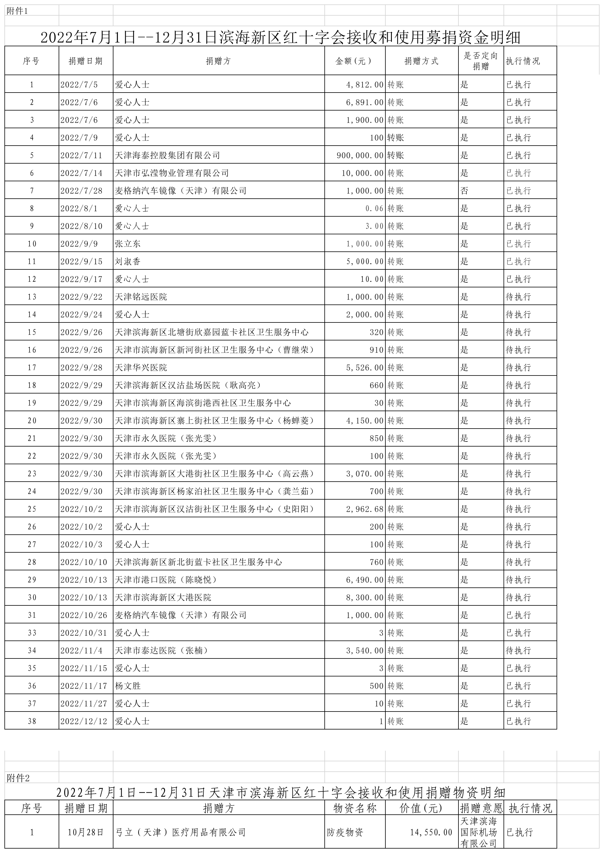 附件1:2022年7月1日--12月31日滨海新区红十字会接收和使用募捐资金明细
